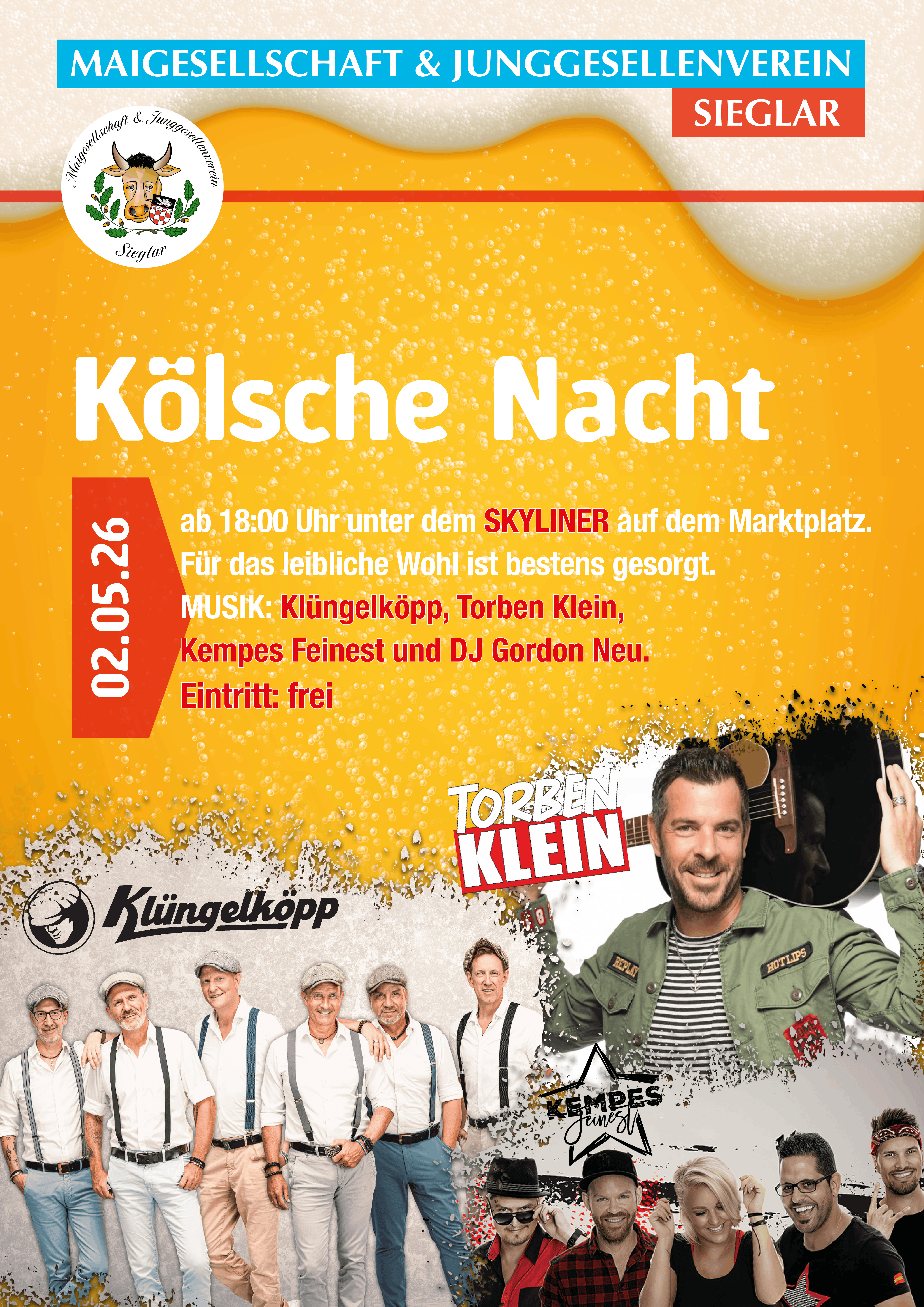 Wer nach dem dunklen, kalten Winter immer noch nicht genug bekommen kann vom lang ersehnten Start in die sonnig-warme Jahreszeit, ist am Freitag, den 02. Mai 2025, herzlich eingeladen zum traditionellen Maiball im heimischen Sieglar ebenfalls mit Foodtruck und süffigem Kölsch oder Longdrinks. Eintritt frei!