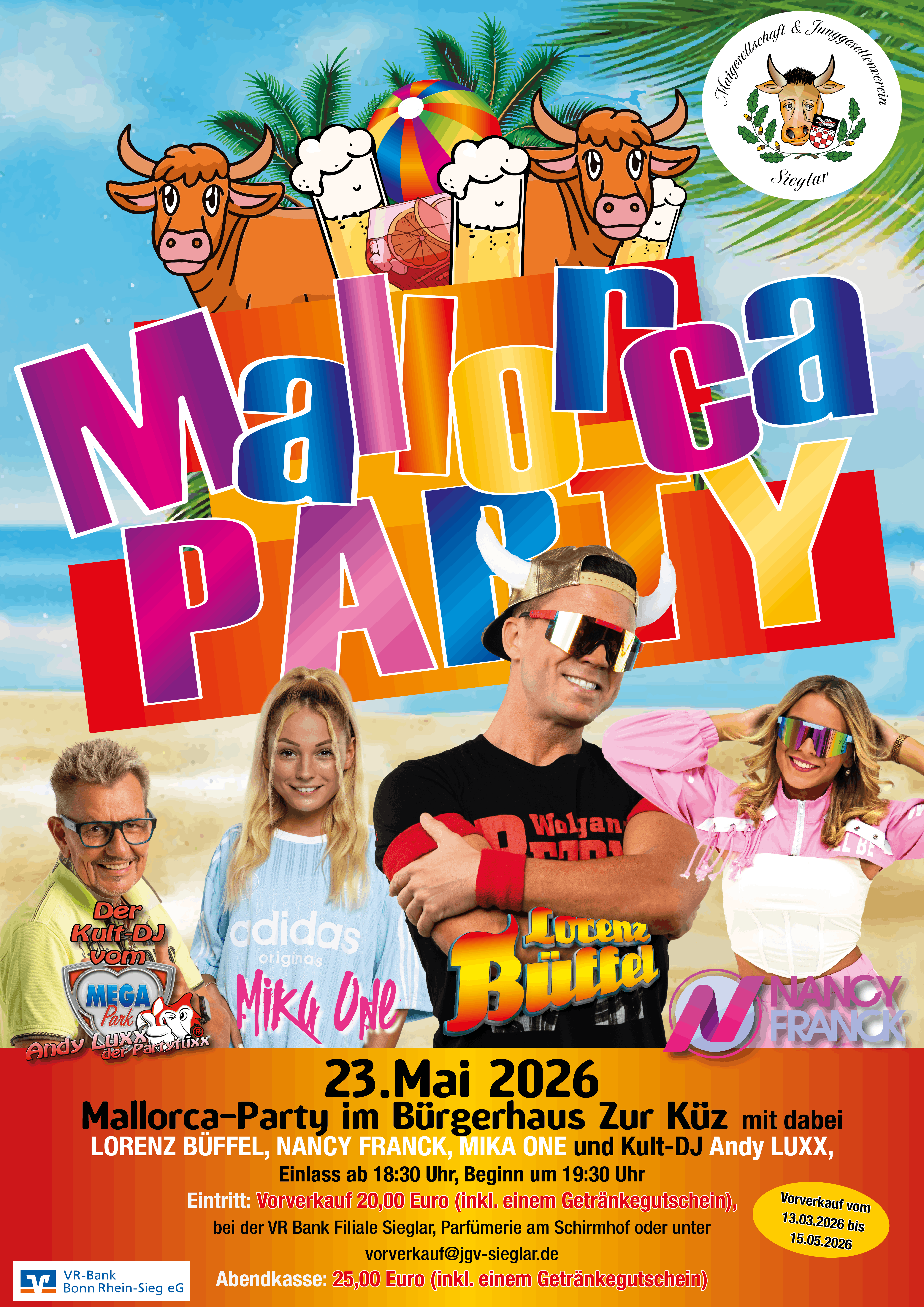 Als Abschluss der Sieglarer Maifest-Woche, findet für alle Feierwütigen und Sommerliebhaber am darauffolgenden Samstag, den 03. Mai 2025, ab 18 Uhr die Mallorca-Party mit dem Kult-DJ vom MegaPark Andy Luxx, Anny, Frenzy und dem Bierkapitän statt. Alle Hartgesottenen Mallorca-Liebhaber erwarten El Arenal-Spezialitäten, „Ballermann-Brause“ von der Longdrinkbar und Mallorca-Feeling in Loor. Karten im Vorverkauf für 8€ (inkl. Getränkegutschein), Abendkasse 15€.